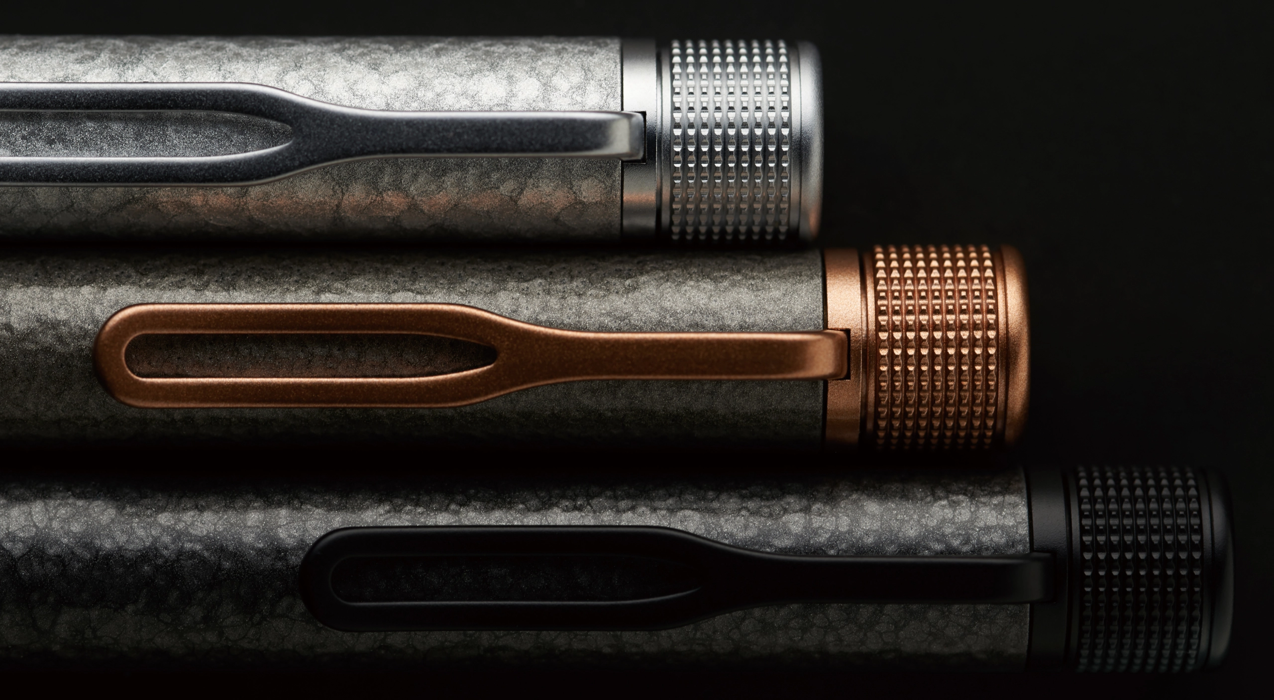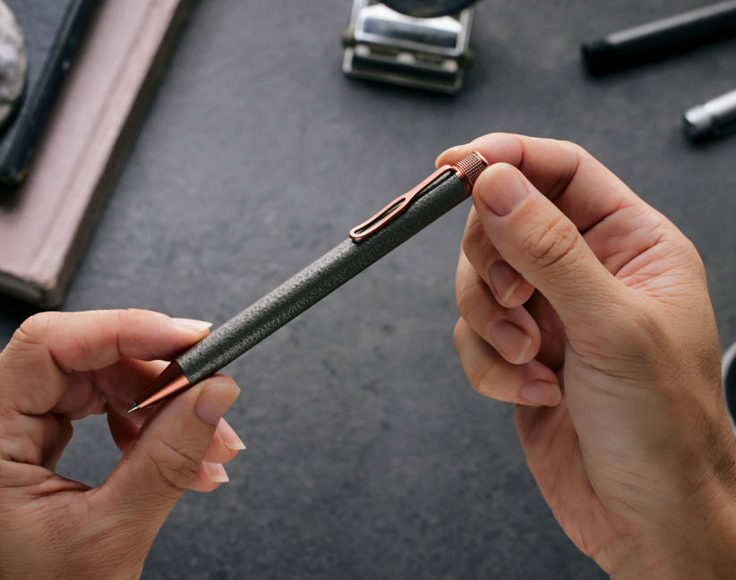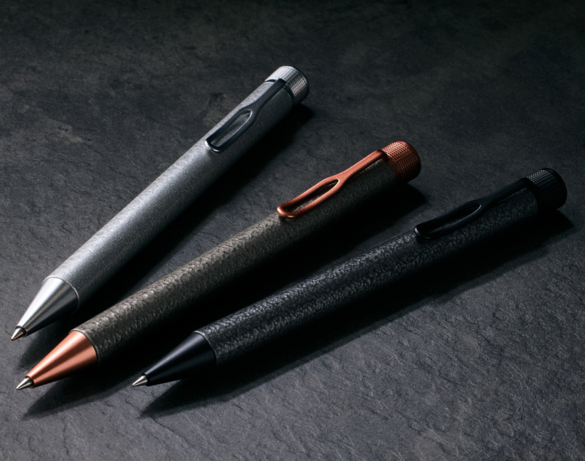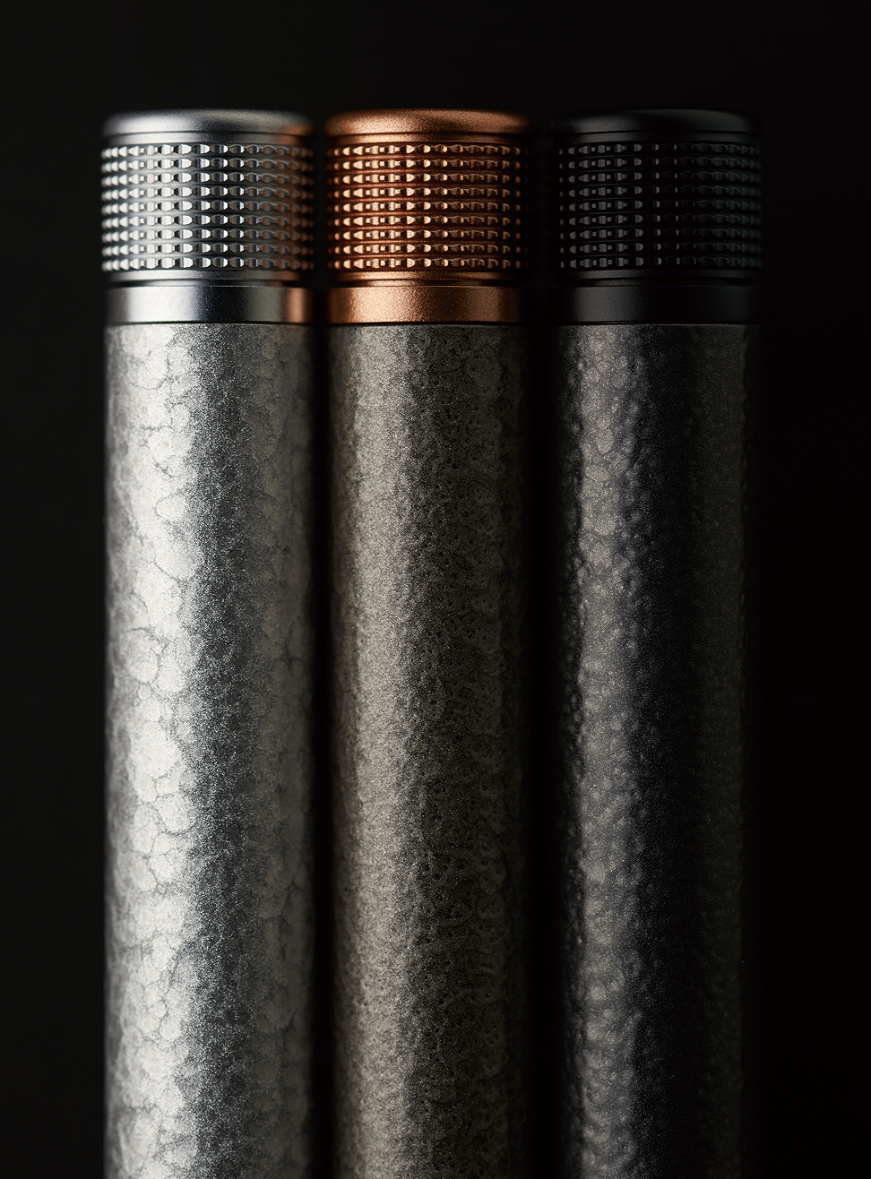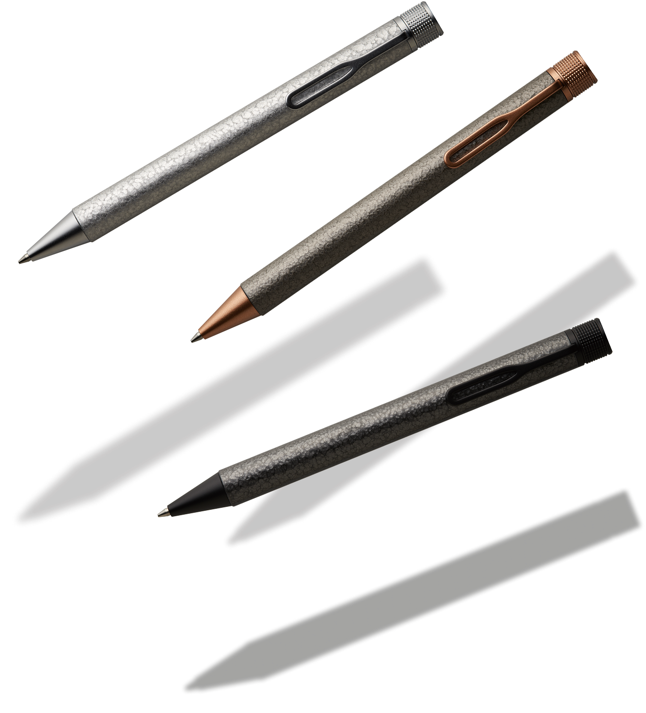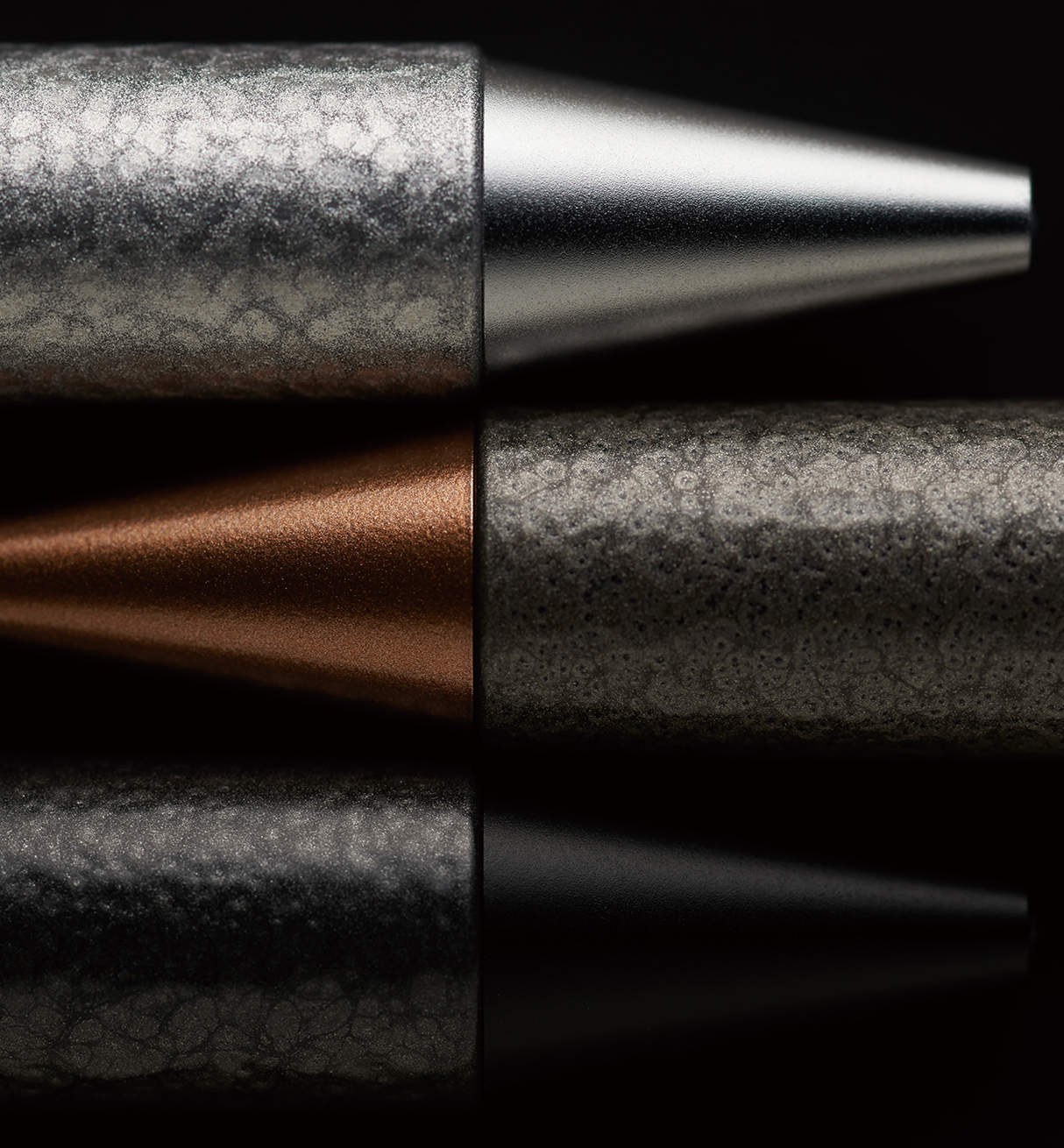 3種類のボディカラーそれぞれにあわせて、ペン先と頭冠にカラーを設定。無骨な質感に、相反するシャープなカラーを組み合わせ、不均衡な美しさを高めています。